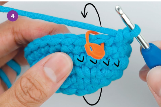 When crocheting in a round, your piece will naturally curl at some point. The direction it naturally curls will make the wrong side face you. To make the right side face you, follow these steps: