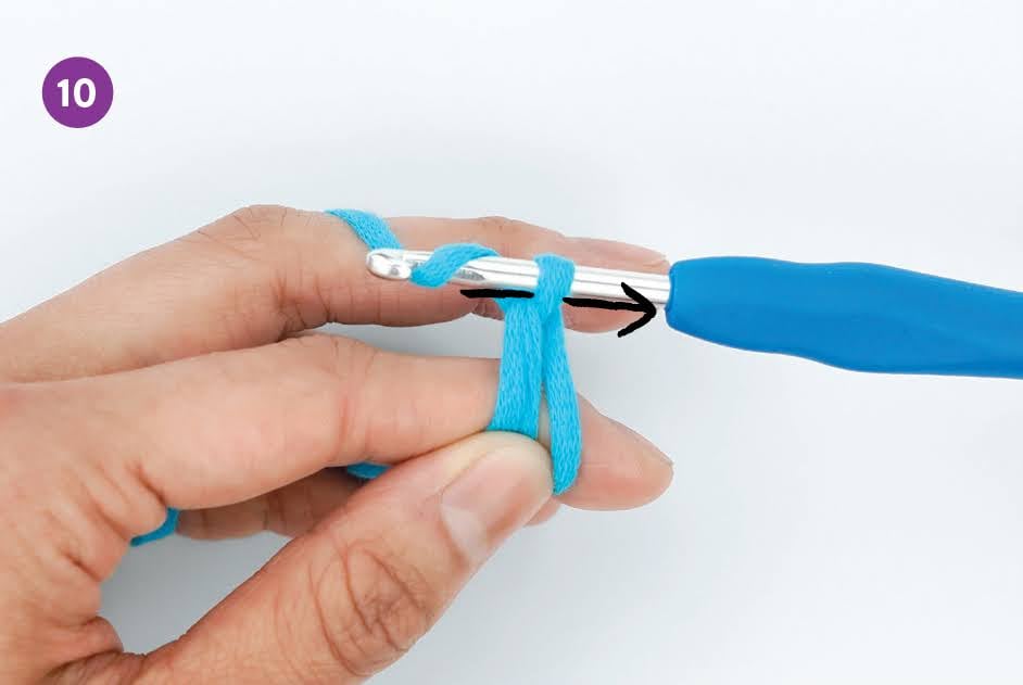 10. Yarn over. Pull the yarn through the loop on the hook. There should be one loop left on the hook.
