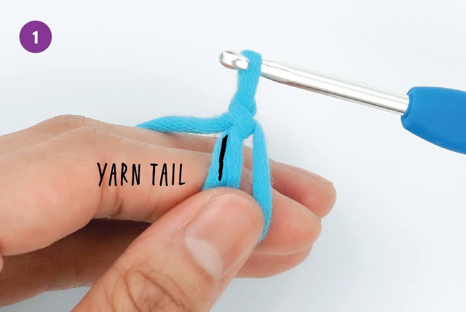 2. Insert the hook through the middle of the loop, from the front to the back. The hook should look like it’s under the left side of the loop and the yarn tail.