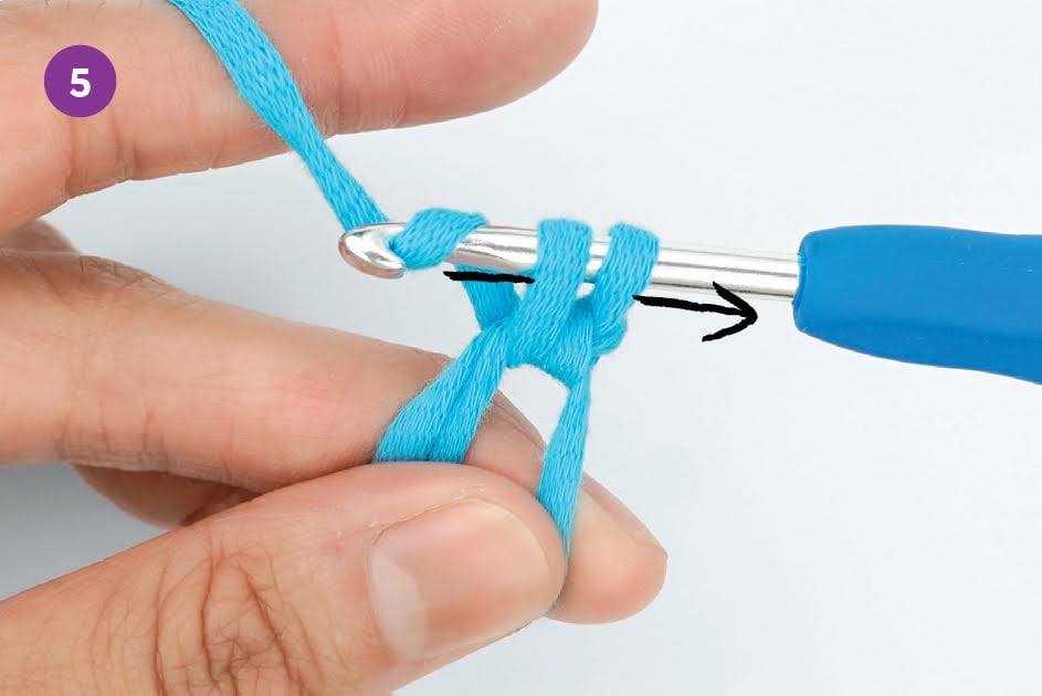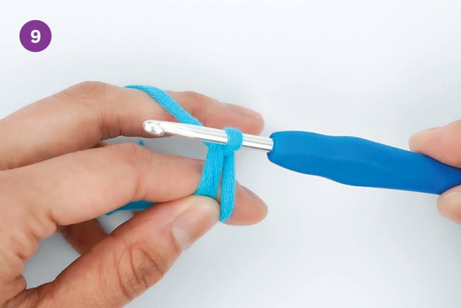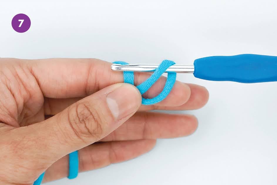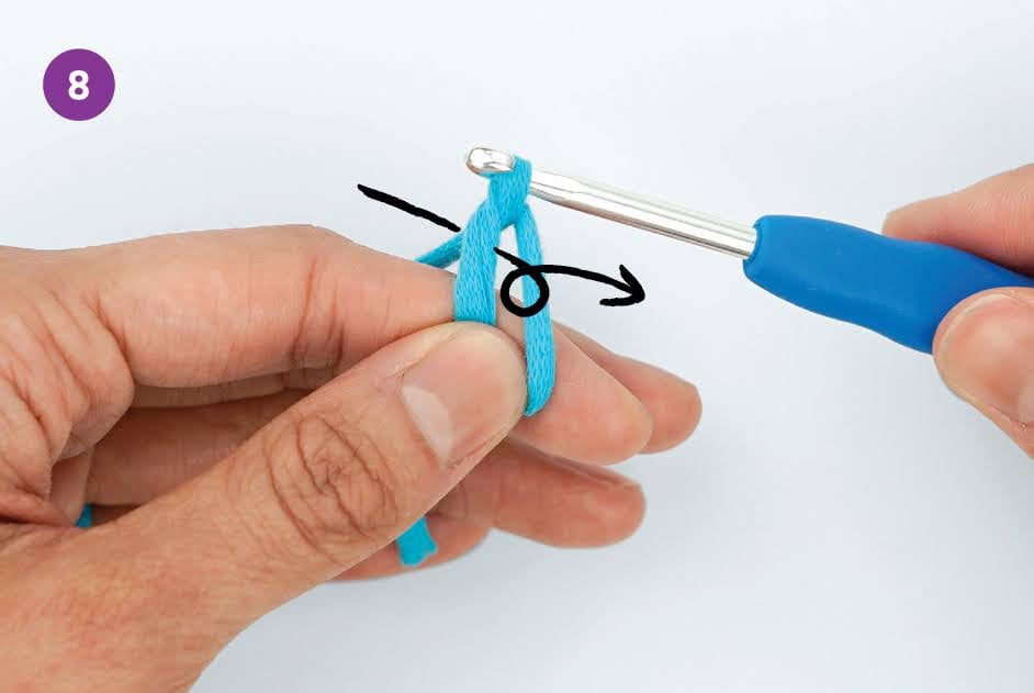 8. Pull the working yarn back through the loop, while rotating the hook so that the tip faces you again, to draw up a loop. If you need more tension in the working yarn, move your middle finger away
